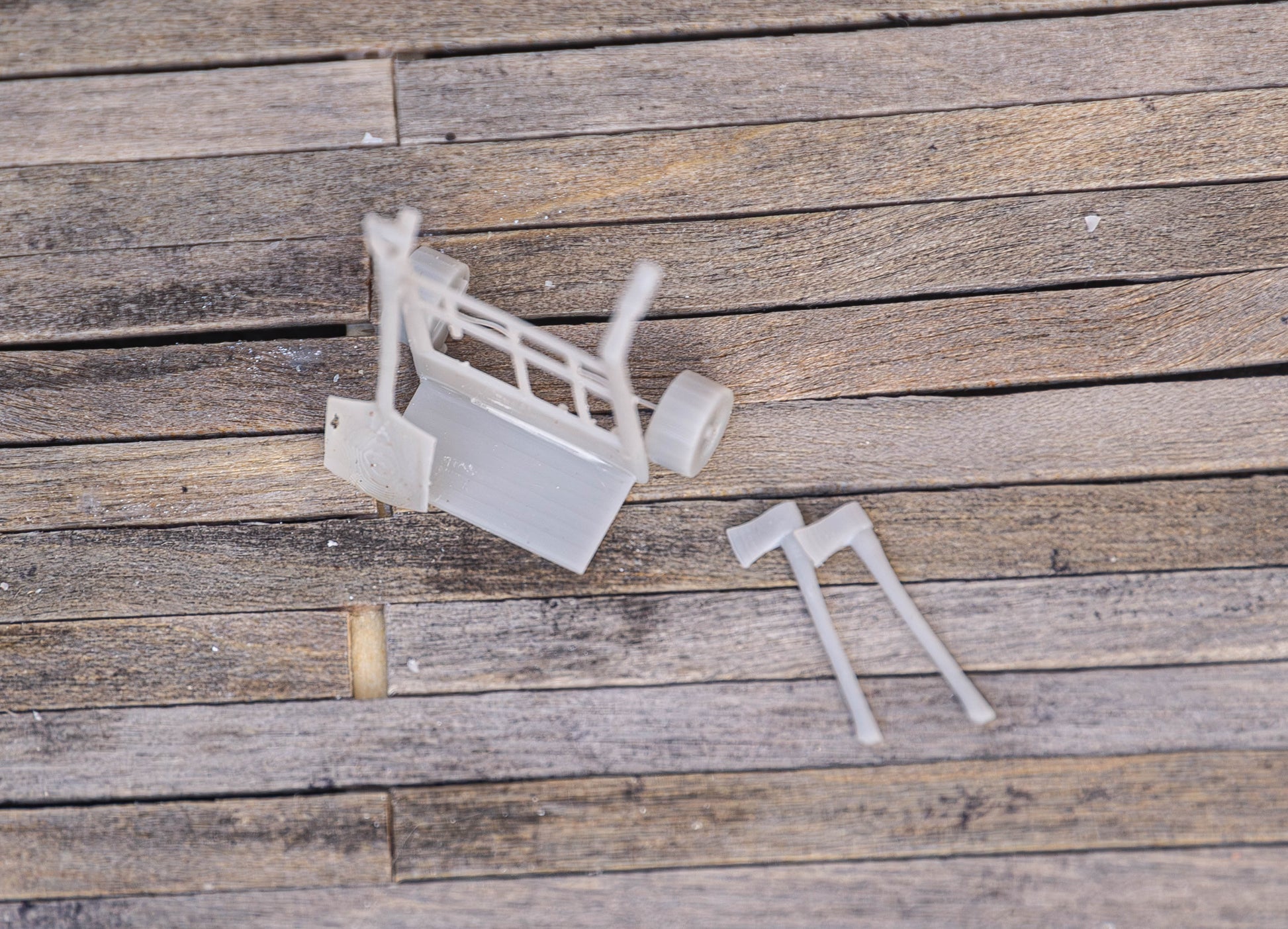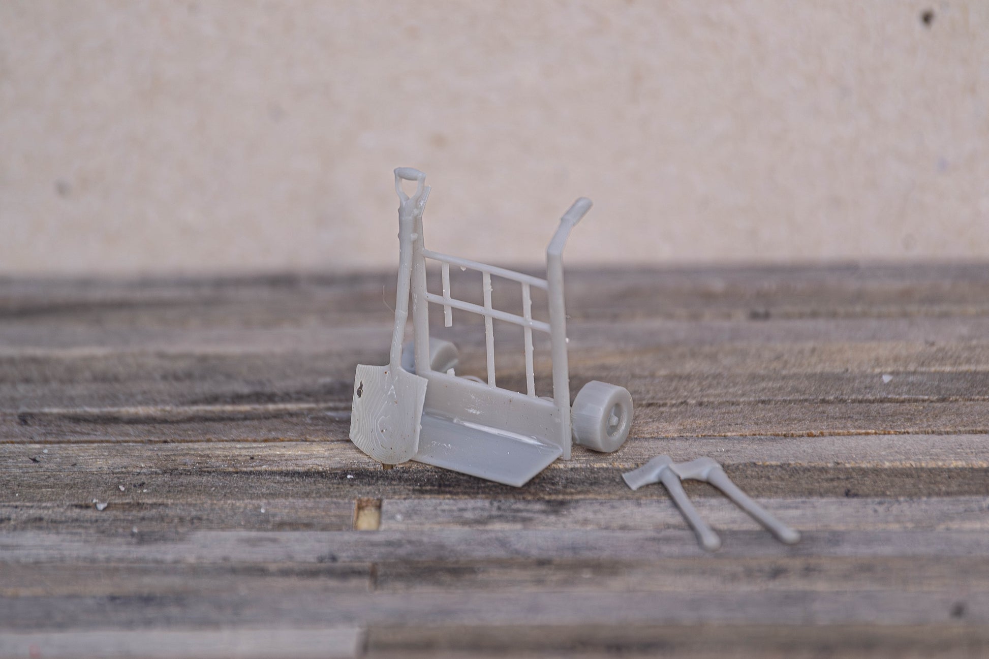 Different tools: axes, cart, shovel. Great addition to any diorama and layout.